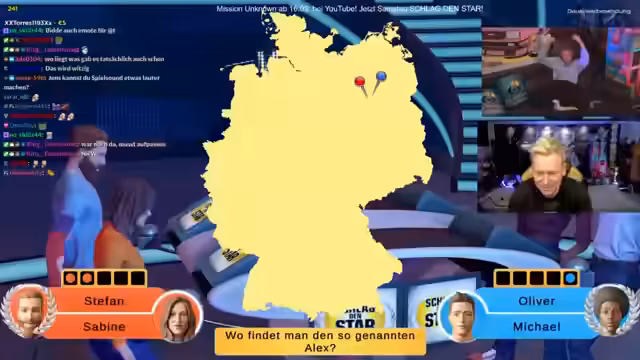 03:23:16Ein interaktives Geografie-Spiel startet, bei dem Spieler Städte auf einer Deutschlandkarte platzieren müssen. Bei der Postleitzahl 46509 (Darmstadt) werden beide Spieler falsch. Auch die Position von Hoffenheim und Darmstadt wird falsch eingeschätzt. Der Streamer kritisiert das Spiel als sehr schwer und gibt an, sich in solchen Ländernkarten-Spielen unsicher zu fühlen.