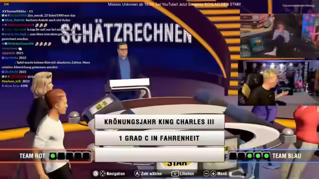02:13:43Nach dem Memory-Duell wechselt der Stream zu anderen Spielrunden wie Schätzrechnen, Sortier- und Entscheidungsspielen. Hierbei werden Themen wie Einwohnerzahlen von Bundesländern, Hochzeitsjubiläen und Temperaturumrechnungen behandelt. Streamer diskutieren die Schwierigkeiten, besonders bei den Einwohnerzahlen, und geben den Tipp, solche Fakten spielerisch durch Toplisten zu erlernen, um sich auf die Show vorzubereiten.