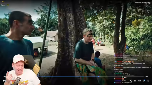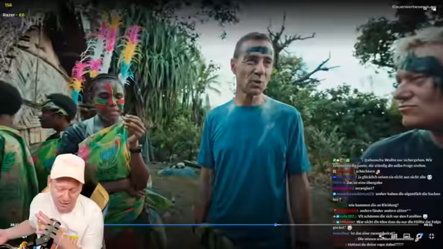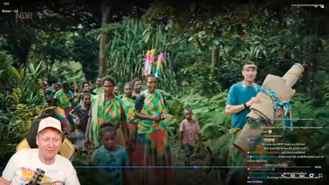 02:31:16Die Stammesmitglieder bereiten eine Hochzeit für Selay und Kent vor. Während Selay als Braut und Lehrerin im Stamm eine zentrale Rolle einnimmt, ist Kent auffällig schweigsam. Der Streamer, der den Besuch organisiert hat, erwähnt auch Basti, den Vulkanforscher und Partner von Ulla, der für die Anwesenheit des Teams sorgt. Die Kinder im Stamm zeigen bei der Vorstellung europäischer Kulturelemente wie Disney-Figuren oder Achterbahnen keinerlei Interesse, außer bei Bildern vom Skifahren des Streamers. Besonders auffällig ist das kleinwüchsige Kind Bob, das den Streamer mit großer Aufmerksamkeit beobachtet und später einen Kopfstand für ihn macht.