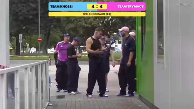 03:16:53Es wird diskutiert, ob es um den ersten Punkt von drei geht. Team Clash Royale nimmt seinen besten Spieler heraus und versucht, drei Punkte zu erzielen. Es wird über die Gültigkeit des Wurfs diskutiert, wobei die Entscheidung getroffen wird, dass die Linie für den vorherigen Punkt zählt. Team Knossi gewinnt die erste Runde. Für die nächste Runde müssen alle Spieler ihre Gegenstände wechseln. Team Knossi beginnt und erzielt zwei Punkte. Team Clash Royale zieht nach und erzielt ebenfalls zwei Punkte. Ein Sandball sorgt für Diskussionen, da er möglicherweise die Linie berührt hat. Der Punktestand beträgt 3 zu 2 für Team Knossi. Mit zwei Punkten hat Team Knossi den Sieg so gut wie sicher. Team Knossi gewinnt das Spiel, wodurch der Gesamtstand auf 4 zu 4 ausgeglichen wird. Es wird angekündigt, dass die Gegenstände nun geworfen statt gerollt werden müssen. Es gibt insgesamt sieben Gegenstände, die von den Teams abwechselnd geworfen werden müssen. Es beginnt das 'Leichtwerfen', bei dem es darum geht, die Gegenstände so weit wie möglich zu werfen. Team Knossi gewinnt die erste Runde mit der Karte.