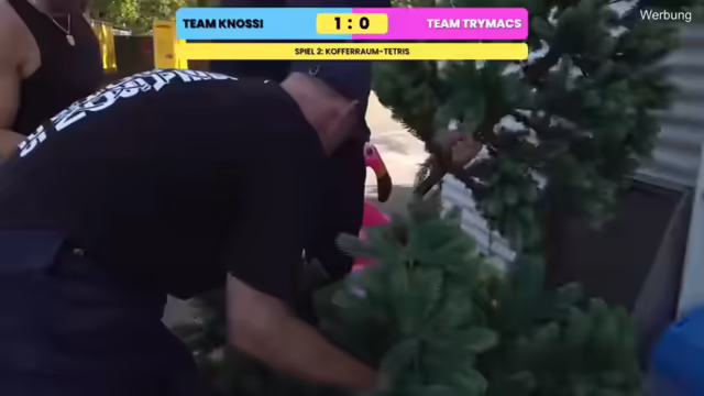 00:46:35Das zweite Spiel ist 'Kofferraum Tetris', bei dem verschiedene Gegenstände (Weihnachtsbaum, Staubsauger, Maskottchen, Pappaufsteller, Scooter, Ball, Rucksack, Chipskarton, Reifen, Basketballnetz, Flamingo) in ein Auto gepackt werden müssen, wobei schwierigere Gegenstände mehr Punkte bringen. Die Teams haben unbegrenzt Zeit, aber bei Gleichstand entscheidet die Zeit. Team Trimax beginnt und baut den Weihnachtsbaum auseinander, um Platz zu sparen. Sie schaffen es, alle Gegenstände in 3 Minuten und 60 Sekunden unterzubringen und die Türen zu schließen. Team Clash Royale versucht ebenfalls, alle Gegenstände unterzubringen, scheitert jedoch daran, die letzte Tür aufgrund von Max' Bein rechtzeitig zu schließen. Team Tick, Trick und Track gewinnt mit 3 Sekunden unterschied. Es wird diskutiert, ob die Fenster geöffnet bleiben dürfen, um den Baum herausragen zu lassen, was jedoch erlaubt wird.