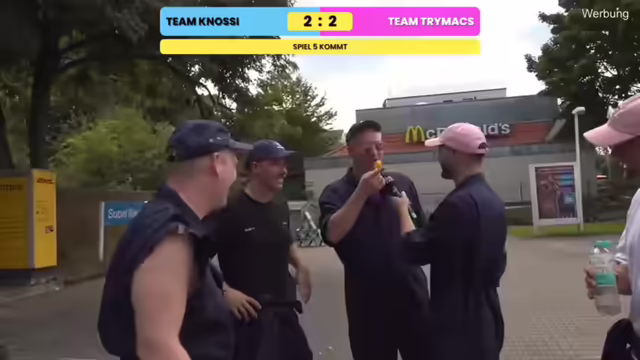 03:26:57Die Teams müssen nacheinander dasselbe Objekt werfen. Es wird über die Ekelhaftigkeit der Taktiken diskutiert, da die Spieler auf die Gegenstände spucken, um sie schwerer zu machen. Ein Spieler liest eine Werbung von Aral vor. Team Knossi gewinnt mit dem Kescher und führt mit 2:0. Für die nächste Runde wird die Spuckrolle gewählt. Team Knossi holt auf und verkürzt auf 2:1. Team Clash Royale wählt den Gummi, den ein Spieler sehr weit wirft. Team Knossi verfehlt das Ziel, wodurch der Punktestand auf 2:2 ausgeglichen wird. Team Clash Royale wählt den Ballon. Es wird diskutiert, ob man den Ballon aufblasen oder mit Wasser füllen soll. Team Clash Royale beschuldigt Team Knossi, Gewichte in den Ballon gefüllt zu haben. Team Knossi beschließt, in den Ballon zu spucken. Ein Spieler von Team Knossi wirft den Ballon, tritt aber über. Beim zweiten Versuch ist der Wurf gültig. Team Clash Royale spuckt ebenfalls in den Ballon. Team Clash Royale gewinnt mit dem Ballon und führt mit 3:2. Team Clash Royale wählt die Muffintüte. Ein Spieler von Team Clash Royale wirft die Tüte weit und gewinnt das Spiel. Damit steht es 5:4 für Team Trimax. Das letzte Spiel ist eine Kofferraum-Reinigungs-Challenge, bei der es darum geht, mit Staubsaugern Konfetti aus den Kofferräumen zu entfernen. Dieses Spiel zählt doppelt.