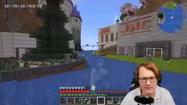 00:08:27Ein Hauptprojekt des Streams ist der Bau einer fotorealistischen Version der Frankfurter Börse. Der Streamer nutzt hierfür Limestone-Bausteine und Copycat-Blöcke für Details wie Regenrinnen. Das langfristige Ziel ist ein automatisches Trading-System. Hierfür sollen Villager in der Börse herumlaufen und an Computerstationen Redstone und andere Items handeln. Als nächstes wird die Konzeption für ein riesiges Aktiendisplay diskutiert, das automatisch Kursdaten anzeigen und sogar Graphen zeigen soll.