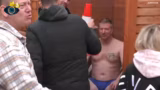 01:02:00Nachdem eine Entscheidung gefallen ist, wird Schradin für angebliches Fehlverhalten zum 'Stuhl der Schande' verurteilt. Das Ritual umfasst eine kalte Dusche mit kaltem Wasser, das auf den Kopf gegossen wird. Währenddessen rufen die anderen Bewohner 'Schande' und bilden ein Spalier. Nach der Strafe wird Schradin mit einem Handtuch abgetrocknet und ihm wird attestiert, dass er aus der Situation gestärkt hervorgehen werde.