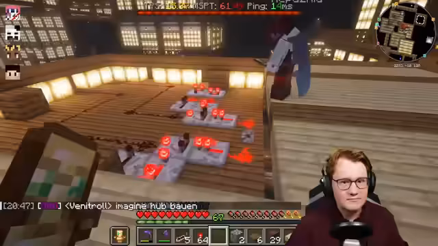 06:10:23Der Streamer plant, einen Alt-F4-Streich bei anderen Spielern durchzuführen, indem er sie dazu bringt, die Freecam-Mod zu aktivieren, während sie gleichzeitig die Alt-Taste gedrückt halten, was zum Absturz des Spiels führt. Der erste Versuch bei Schradin wird vorbereitet, indem ein Buzzer-Sound abgespielt wird, um ihn zu verwirren. Währenddessen wird die Infrastruktur hinter dem Freizeitpark weiter ausgebaut, um eine XP-Farm und eine Trading Hall zu integrieren, bevor mit dem Bau weiterer Spiele begonnen wird. Das Design des Freizeitparks wird von Pumi als unglaublich gut beschrieben. Die Funktionsweise eines Bingo-Spiels mit 7-Segment-Displays wird erklärt, wobei eine kleine Grafikkarte die Zufallszahlen darstellt. Der Streich wird erfolgreich bei Elina durchgeführt, die daraufhin ihr Spiel neu starten muss. Weitere Versuche werden bei anderen Spielern wie Kevin, Hugo, Mori und Zombie unternommen, wobei einige den Trick durchschauen, während andere, wie Mina, ebenfalls darauf hereinfallen und ihr Spiel abstürzt. Der Streamer genießt die Reaktionen der Spieler und die erfolgreichen Streiche, die er als „herrlich“ bezeichnet.