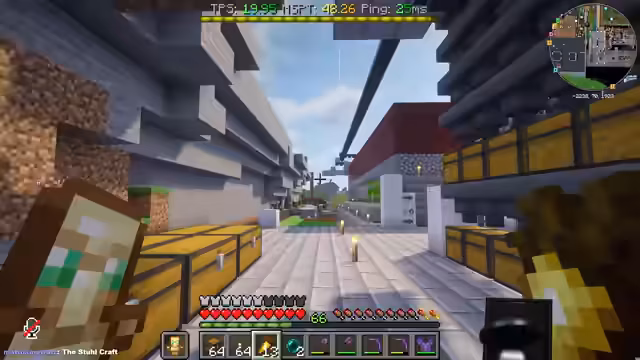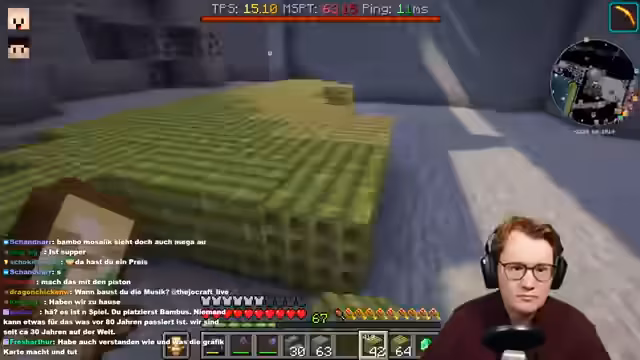 04:47:11Die Musik wurde nach einer Vorlage eines Minecrafters namens 'Perfect Grammar' entwickelt und angepasst. Es wird erklärt, dass jeder einzelne Notenblock einen Klang erzeugt, der sich mit anderen Blöcken zu dem gesamten Song addiert. Es wird darum gebeten, die Notenblöcke nicht anzuklicken, da dies ihre Stimmung verändern würde. Der Song kann nun dauerhaft als Loop abgespielt werden. Es wird erläutert, dass die Musik aus zwei Teilen besteht: der Melodie und einer Loopstation für das Schlagzeug. Die Server-Performance bleibt ein großes Problem, da die TPS-Werte weiterhin niedrig sind und das Spiel stark verlangsamen. Es wird erneut vorgeschlagen, alle nicht benötigten Schafe und Entitäten zu schlachten, um die Server-Performance zu verbessern. Die niedrigen TPS-Werte (aktuell 13,0) bedeuten, dass das Spiel fast halb so langsam läuft wie normal. Es wird auch erwähnt, dass ein Update auf die neueste Minecraft-Version aufgrund der Instabilität und der potenziell noch schlechteren TPS-Werte nicht möglich ist. Die Baumeister werden gebeten, die Plattformen oben und unten mit Slaps zu schließen, um die Technik zu verbergen. Der Streamer wird morgen an der Technik weiterarbeiten und plant, die Loopstation in einem der Gebäude zu bauen und ein Kabel dorthin zu führen.