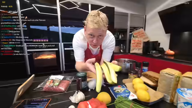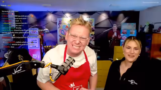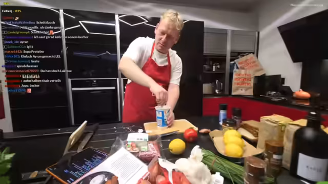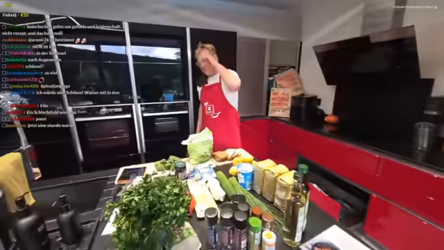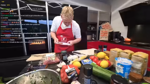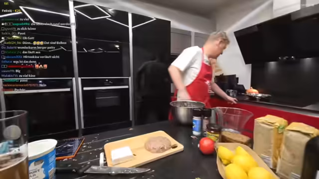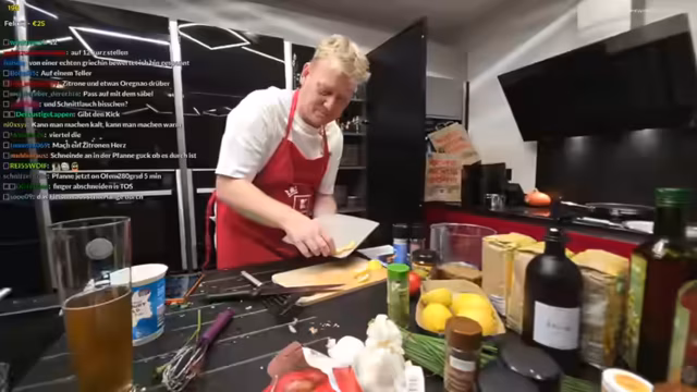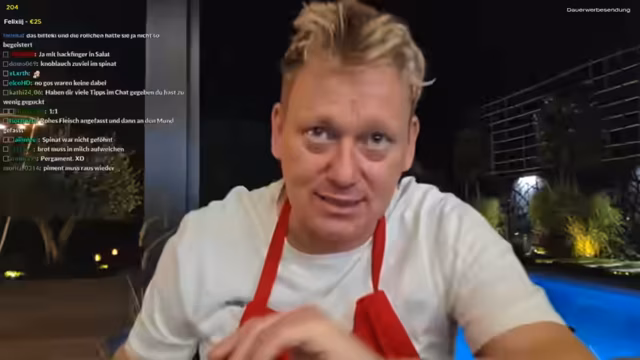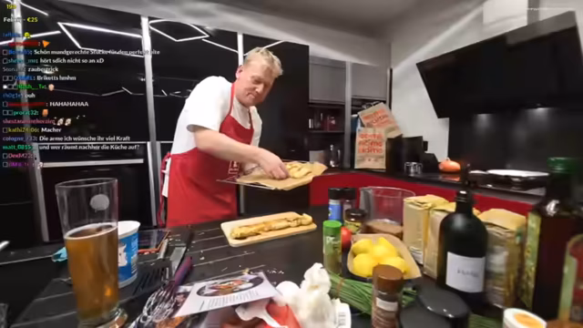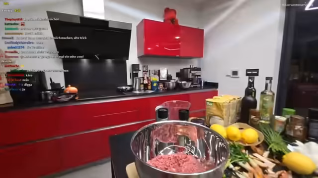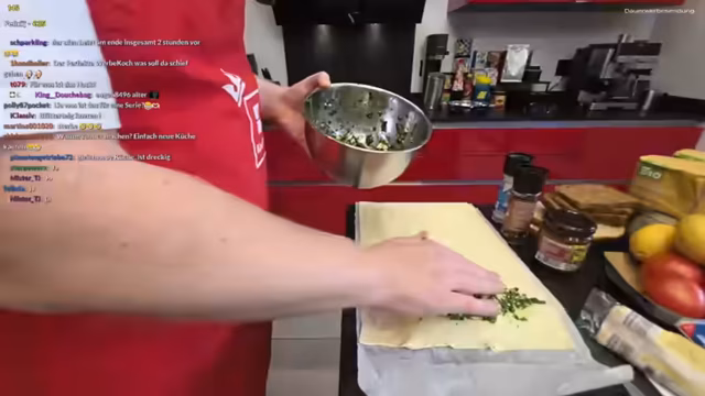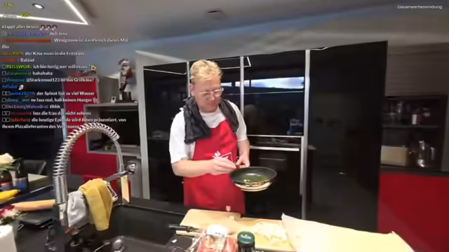 01:50:23Der Streamer fährt fort, indem er Käse und Pinienkerne in die Spinat-Knoblauch-Mischung gibt. Er schwärmt von der Qualität der Pinienkerne und der gesamten Füllung, die er als „unglaublich geiles Essen“ bezeichnet. Währenddessen gibt es eine kurze Unterbrechung, da eine Alertbox im Stream fälschlicherweise ausgelöst wird, was jedoch schnell behoben wird. Nach dem Vermischen der Zutaten wird die Füllung als perfekt befunden. Der Streamer erlaubt seiner Partnerin einen kurzen Blick auf die Füllung, um ihre Reaktion festzuhalten, und der Chat bestätigt die Qualität seiner Arbeit. Trotz kleinerer Spritzer Spinat an der Wand bleibt die Stimmung ausgelassen.