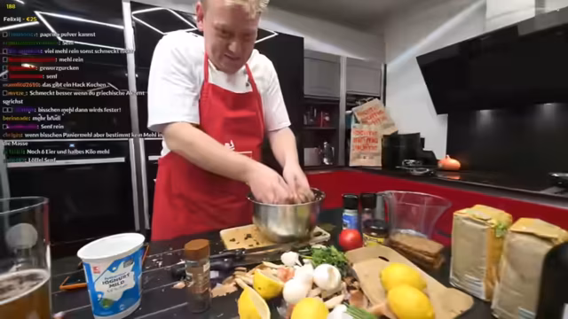 03:13:44Die Masse für das Biftiki ist nun fertig geknetet und wird in die richtige Form gebracht. Der Streamer ummantelt die Fleischklopse mit Schafskäse und brät sie anschließend in einer Pfanne mit Rapsöl an. Währenddessen kommt es zu einem humoristischen Disput mit seiner Frau, die Mehl als Zutat vorgesehen hatte, der Streamer dies jedoch ablehnt. Die Fertigstellung der Hauptspeise steht bevor.