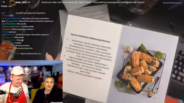 01:58:43Der Streamer präsentiert stolz seine zweite Blätterteigrolle und vergleicht sie mit der ersten, um die Fortschritte zu zeigen. Er experimentiert weiter mit verschiedenen Mustern und Formen, um eine Vielfalt an Röllchen zu schaffen. Er lobt sich selbst für die Verbesserung seiner Technik und die Qualität der Röllchen. Nach der Fertigstellung aller vier Röllchen, die unterschiedliche Formen und Größen aufweisen, werden sie mit Eigelb bestrichen und in den auf 180 Grad vorgeheizten Ofen geschoben. Die Backzeit wird auf etwa 15 Minuten geschätzt, und der Chat wird gebeten, ihn an die Überprüfung zu erinnern. Der Streamer ist sichtlich zufrieden mit dem ersten Gericht und bereitet sich auf die nächsten Schritte vor, während die Blätterteigröllchen im Ofen backen.