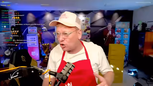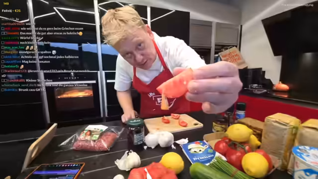 00:04:09Der Stream beginnt mit Musik und der Begrüßung des Chats. Der Streamer inszeniert sich als Küchenchef in einem griechischen Restaurant. Er begrüßt eine imaginäre Gastfrau und versucht, eine seriöse Atmosphäre zu schaffen, während er humorvolle Ablenkungen wie Musikwünsche und Bemerkungen über „Flecken am Boden“ einbaut. Er stellt stolz sein Restaurant vor und betont, dass die Küche an diesem Tag zum ersten Mal ernsthaft genutzt wird, um drei griechische Gerichte zuzubereiten.