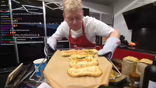 01:54:30Die Kamera wird näher an das Geschehen gerückt, damit die Zuschauer die Zubereitung des Teigs hautnah miterleben können. Der Streamer beginnt, die Füllung in Blätterteig einzurollen und zu formen. Er experimentiert mit verschiedenen Techniken, um die Röllchen zu perfektionieren, und fragt den Chat nach Meinungen zu Länge und Dicke. Er versucht, die Ränder der Röllchen sorgfältig zu verschließen, um ein Aufplatzen während des Backens zu verhindern. Dabei bemerkt er, dass das Backblech im Ofen noch heiß ist, was zu einer kurzen humorvollen Unterbrechung führt. Er präsentiert seine erste Blätterteigrolle und bittet um ehrliches Feedback, um seine Technik zu verbessern. Er stellt fest, dass er den Teig dicker hätte nehmen sollen und passt seine Methode für die folgenden Röllchen an, um mehr Füllung unterzubringen und eine stabilere Form zu erzielen. Er betont die Handarbeit und Leidenschaft, die in jedes Röllchen fließt.