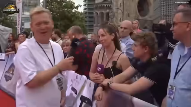 02:55:10Der Streamer plant, den Stars persönliche Fragen zu stellen, insbesondere über ihre Erfahrungen mit den Dinosauriern beim Dreh. Er unterhält sich auch mit anderen Medienvertretern und macht ein kurzes Video für einen Fan namens Max. Er ist sichtlich beeindruckt von der Größenordnung der Veranstaltung und der Anwesenheit von internationalen Prominenten und fühlt sich in seinem Element.