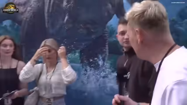 01:01:37Ein Höhepunkt des Streams ist die Begegnung mit der lebensgroßen Attraktion des neuen Dinosauriers Dolores. Der Streamer ist sichtlich beeindruckt und überwältigt von dem Anblick. Er beschreibt sie als unglaublich realistisch und lebendig und ist begeistert, dass sie eine zentrale Rolle im neuen Film spielt. Diese Begegnung unterstreicht die besondere Authentizität der Veranstaltung.