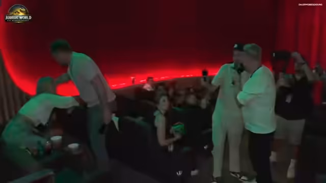 05:01:15Nachdem die Prominenten den Saal wieder verlassen haben, hält der Streamer eine kurze Ansprache. Er betont die Einzigartigkeit des Moments und ruft die Zuschauer auf, Tickets für den Film zu kaufen, der am 2. Juli in die Kinos kommt. Er sorgt für Stille, indem er die Aufforderung gibt, alle Handys in bereitgestellte, versiegelte Beutel zu stecken, um das Kinoerlebnis zu schützen. Er wünscht allen viel Spaß und leitet die Vorführung von Jurassic World ein.