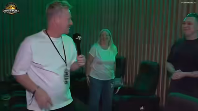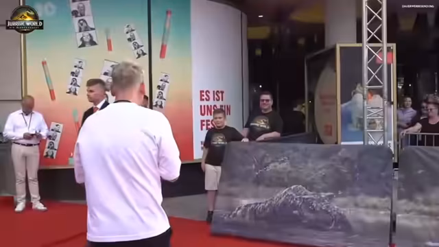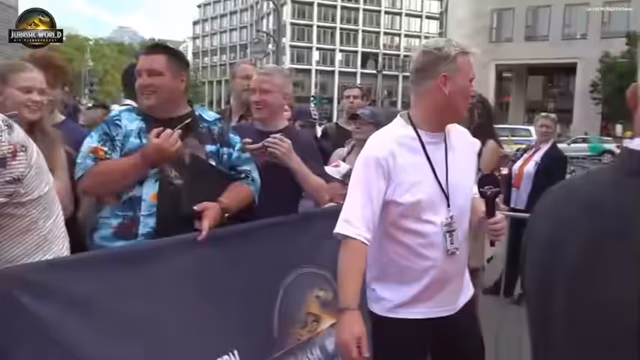 02:42:33Der Streamer betont erneut, dass auf den Sitzen eine Überraschung liegt und die Gäste nun langsam in die Kinosäle eintreten sollen. Er begrüßt die ankommenden Stars wie Scarlett Johansson, Jonathan Bailey, Mahershala Ali und Gareth Edwards persönlich und führt kurze Interviews mit ihnen. Dabei unterhält er sich auch mit einem extremen Jurassic-Park-Fan, der ihn sogar bei seiner Hochzeit mit einem Jeep aus dem Film beeindruckt hat.