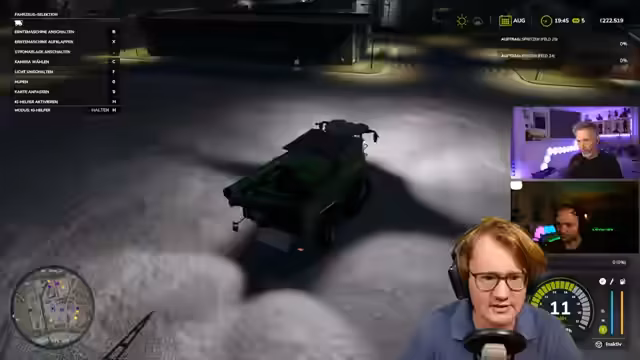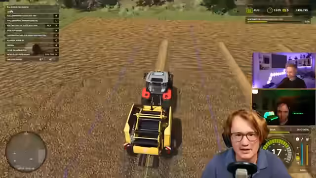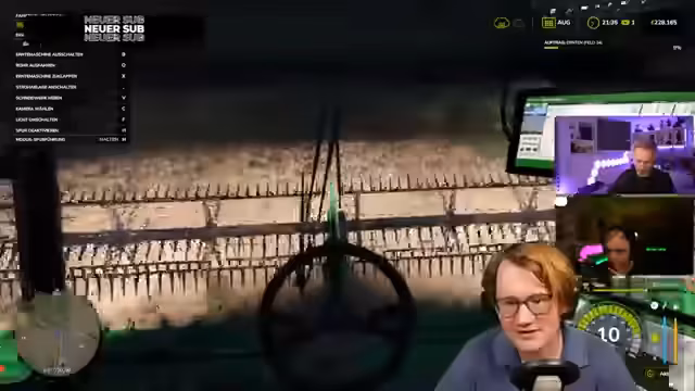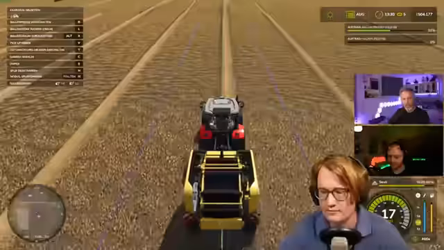 00:59:47Es wird sich gefragt, welche Höhe und Weite die Haspel braucht. Es wird sich gefragt, wie man den Trecker, der umgekippt ist, wieder aufrichtet. Es wird sich gefragt, wie man das ganze Mähwerk runter macht. Es wird sich gefragt, wie man die Haspel einstellt. Die Erntemaschine wird aufgeklappt und angeschaltet. Es wird realisiert, wie man Fahrzeuge resetten kann. Es wird ein Anhänger bestellt. Es wird sich gefragt, wie man Sprit bekommt. Der Sprit ist aber noch voll. Es wird festgestellt, dass man mit dem Tempomaten die Geschwindigkeit ändern kann. Es wird festgestellt, dass der Typ dem Streamer aus dem Gesicht geschnitten ist. Es wird sich gefragt, woher das Spiel weiß, dass der Streamer braune Augen hat. Es wird festgestellt, dass der KI-Helfer Geld kostet. Es wird sich gefragt, wie es mit dem Anhänger aussieht. Der Anhänger wird gekauft. Es wird versucht, den Anhänger anzudocken. Es wird ein Frontgewicht benötigt. Der Streamer kommt zum Hof.