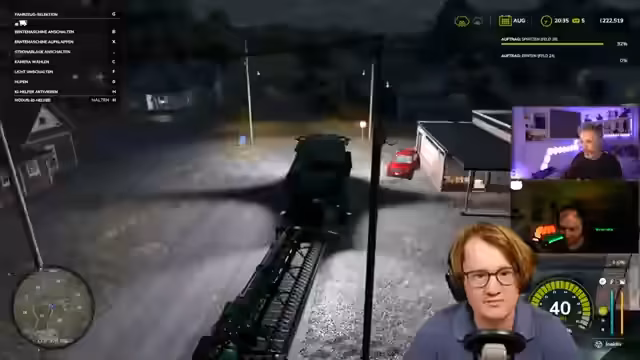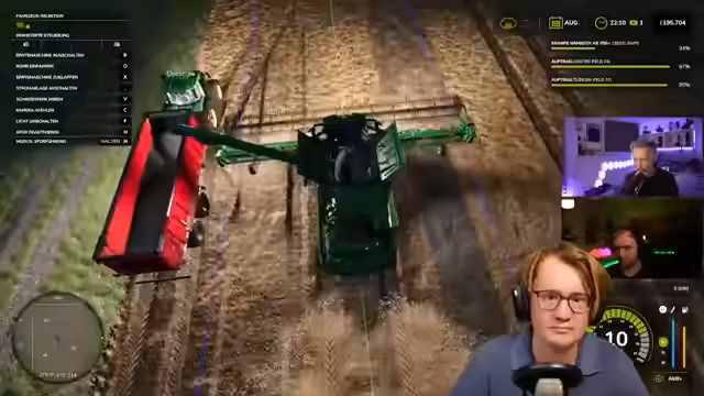 03:25:54Die Detailarbeit im Spiel, wie die aktiven Scheibenwischer bei Regen, wird gelobt. Es wird überlegt, ob man die Warnblinkanlage einschalten sollte, wenn man auf dem Feld unterwegs ist. Die wachsende Begeisterung für das Spiel wird ausgedrückt, und die Möglichkeit, mit einem Lenkrad zu spielen, wird in Betracht gezogen. Es wird diskutiert, dass das Spiel zwar Spaß macht, die Realität der Landwirtschaft aber noch viel härter ist. Die verbleibende Zeit für einen Auftrag wird überprüft, und es wird die Zusammenarbeit mit Debitor koordiniert, um das Abladen während der Fahrt zu optimieren. Ein Kommentar aus dem Chat deutet darauf hin, dass das Rundumlicht verwendet wird, um anzuzeigen, dass der Drescher fast voll ist. Ein autonomer Modus des Dreschers wird vorgestellt. Es wird überlegt, was mit dem Stroh auf dem Feld passiert und ob es zum Düngen verwendet wird. Die Möglichkeit, Kalk auszubringen, um den Ertrag zu steigern, wird diskutiert. Die Streamer koordinieren sich weiterhin, um effizient zu ernten und das Feld zu bearbeiten.