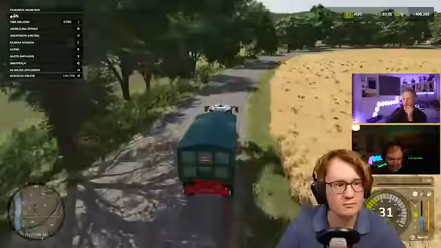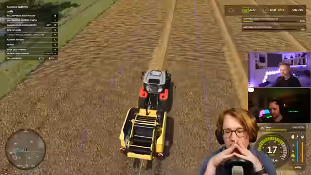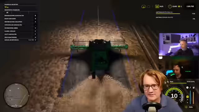 00:54:28Der Streamer versucht, aus dem Traktor auszusteigen, aber drückt stattdessen Tab. Es wird herausgefunden, wie man aussteigt. Debitor wird gebeten, mit Tab zum Team zu kommen. Der Streamer fährt mit dem Traktor und versucht, das Mähwerk anzuhängen. Es wird festgestellt, dass man rückwärts fahren muss, damit der Kilometerstand nicht hochgeht. Die Kameraperspektive wird angepasst. Es wird versucht, das Mähwerk anzuhängen. Es wird erklärt, wie man mit H eine Zielposition setzt und das Auto von alleine dorthin fährt. Es wird festgestellt, dass der KI-Helfer Geld kostet. Der Streamer versucht, mit der Steuerung klarzukommen. Es wird festgestellt, dass das Mähwerk gemietet ist. Es wird versucht, auf dem Schneidwerk mitzufahren. Der Streamer fährt schlecht und nimmt fast eine Brücke mit. Es wird überlegt, einen Xbox-Controller anzuschließen. Es wird festgestellt, dass man den Fahrer nicht aus dem Auto ziehen kann. Es wird festgestellt, dass es Strafzettel geben würde, wenn man so fahren würde. Es wird festgestellt, dass man sich mit Tab in ein anderes Fahrzeug teleportieren kann. Es wird ein leerer Trecker benötigt, um sich teleportieren zu können. Es werden zwei Felder gekauft. Es wird festgestellt, dass noch ein Skoda da ist. Es wird zurück zum Autohof gefahren. Es wird ein Anhänger benötigt, um das Feld zu dreschen und das Erntegut einzuladen. Es wird die Verantwortung an die anderen Spieler übergeben.