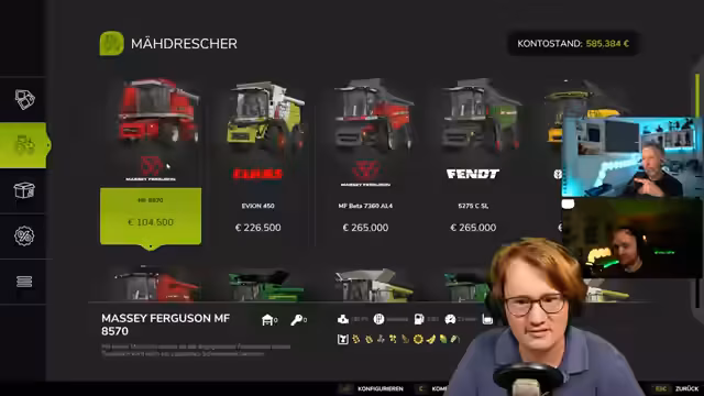 00:48:44Es wird festgestellt, dass man im Spiel mit 750.000 Euro und einem Hof im Besitz startet. Es wird überlegt, was als Nächstes gekauft werden soll. Der Chat schlägt vor, mit Holzfällen anzufangen. Der Streamer möchte sich einen Skoda kaufen, aber es wird entschieden, dass ein Mähdrescher benötigt wird, um das Feld zu abernten. Es wird festgestellt, dass Mähdrescher teuer sind. Es wird nach gebrauchten Fahrzeugen gesucht. Der Chat schlägt vor, Fahrzeuge zu mieten statt zu kaufen. Ein Traktor im Angebot wird für 40.000 Euro gekauft. Es werden die Motorvariante, Reifen und Frontladerbau ausgewählt. Der Chat schlägt erneut vor, zu mieten statt zu kaufen. Es wird beschlossen, einen normalen Traktor zu kaufen, da dieser für alles benötigt wird. Der Traktor wird beim Händler abgeholt. Es wird festgestellt, dass man sich einfach in Fahrzeuge reinsetzen kann. Der Streamer findet sich nicht auf der Karte zurecht. Es wird zum Hof gefahren. Es wird nach einem Mähdrescher zum Mieten gesucht. Der Chat schlägt vor, den Tempomat zu benutzen. Es wird festgestellt, dass das Auto von alleine fahren kann, wenn man eine Zielposition auf der Karte setzt. Es wird zwischen Kaufen und Mieten umgeschaltet. Ein Mähdrescher wird für einen Tag für 5.000 Euro gemietet. Es wird ein Mähwerk benötigt.
