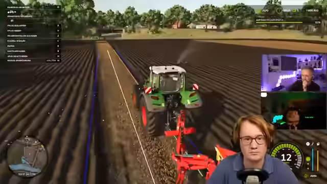 02:13:31Es wird diskutiert, ob sich das Lenkrad bei Traktoren mit GPS-gestütztem Guiding-System tatsächlich von alleine bewegt, was von Zuschauern bestätigt wird. Die Automatisierung wird als sehr befriedigend empfunden. Der Streamer spart sich einen Arbeitsgang, da er Grubbern und Säen gleichzeitig erledigt. Es wird die Funktion des Pflugs erklärt, der zur Bodenauflockerung, Nährstoffverteilung und Unkrautreduzierung dient. Die Grafik des Pflugs wird als sehr gelungen hervorgehoben. Ein Zuschauerbeitrag erwähnt Twitch Farming, wo jemand live seine Feldarbeit streamt. Es wird diskutiert, dass Pflügen möglicherweise nicht mehr dem neuesten Stand entspricht, da es energieintensiv ist und Nachteile haben kann. Alternativ wird ein Unkrautvernichtungssystem von NVIDIA mit Lasern erwähnt. Der Streamer sucht nach den letzten Bäumen für einen Auftrag und spricht mit RGB über dessen Nachbarfeld. Die beiden sehen sich gegenseitig im Spiel fahren, was als cool empfunden wird. Der Plan für den Bauernhof ist, mit 750.000 Euro zu investieren und das Geld in Helsing-Kampfdrohnen zu investieren, was zu einer Diskussion über den Gründer von Spotify führt, der in Helsing investiert hat.