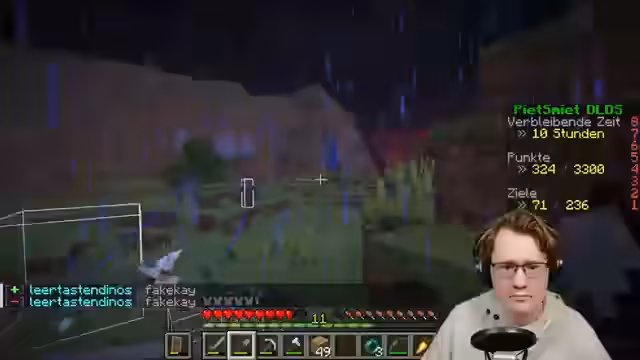 02:10:15Ein Aufruf an den Chat wird gestartet, die offizielle DLDS-Liste zu konsultieren, um bei der Achievement-Jagd zu helfen. Es wird die Idee diskutiert, Skelette für einen Erfolg zu nutzen. Es wird beschlossen, gemeinsam in den Nether zurückzukehren, wobei der Fokus auf gegenseitigem Schutz liegt. Die Notwendigkeit von Strings für Achievements wird betont. Ein Schlafversuch im Spiel scheitert zunächst, aber es wird die Zusammenarbeit betont, um dies zu erreichen. Die Verteilung von Ressourcen, insbesondere Quarz, wird koordiniert, um gemeinsam Achievements zu erzielen. Nach einem Blitzeinschlag wird überlegt, ob dies ein Achievement auslöst, und verschiedene Szenarien werden diskutiert, darunter das Treffen eines Dorfbewohners oder einer Hexe vom Blitz. Ein Blitzableiter wird gebaut, um dies zu testen. Nach dem Sammeln von Crying Obsidian werden Punkte verteilt und überlegt, welche Achievements noch fehlen. Die Nether-Aktion wird als Möglichkeit gesehen, einfach Punkte zu sammeln, und es wird die Ausrüstung überprüft. Ein Freefall-Achievement wird erzielt.
