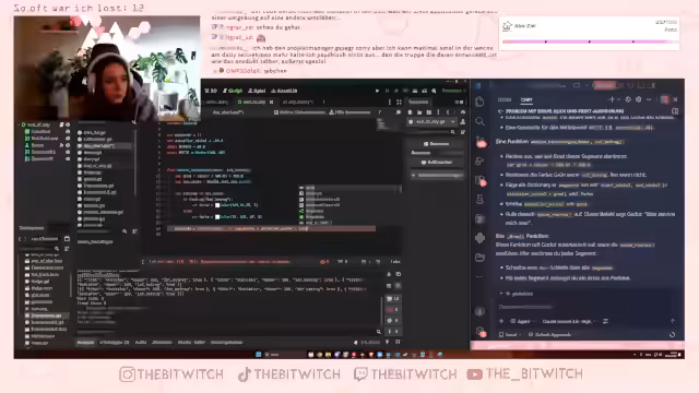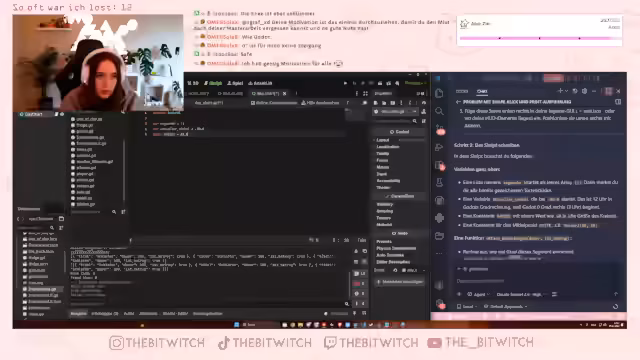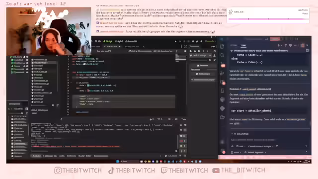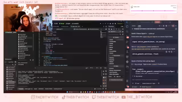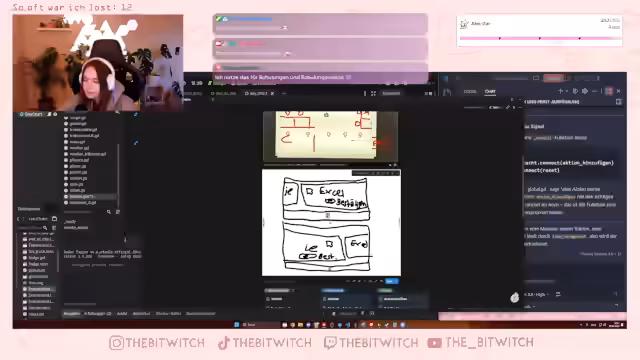 01:50:44Die Streamerin beschreibt ihre Programmierkenntnisse - sie kann GDScript, Python Basics und meist JavaScript für Frontend. Sie macht gerade Erfahrungen im Game Development mit Godot Engine. Sie diskutiert das Design einer Ingame-GUI, insbesondere ein Pie-Chart, das den Tagesverlauf mit grünen und roten Abschnitten für Arbeit und Arbeitszeitbetrug darstellen soll. Die Katze schneidet dabei ihre Konzentration und sie beschreibt sich als nervös wegen der vielen Kabel und giftigen Pflanzen im Raum.