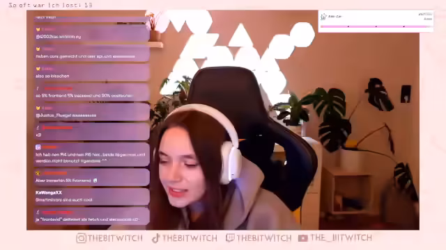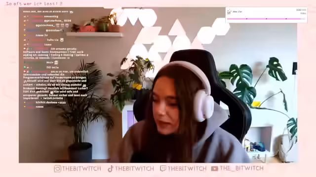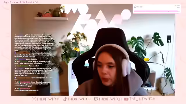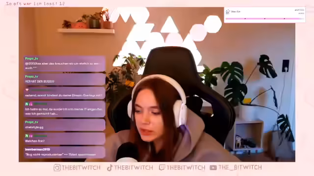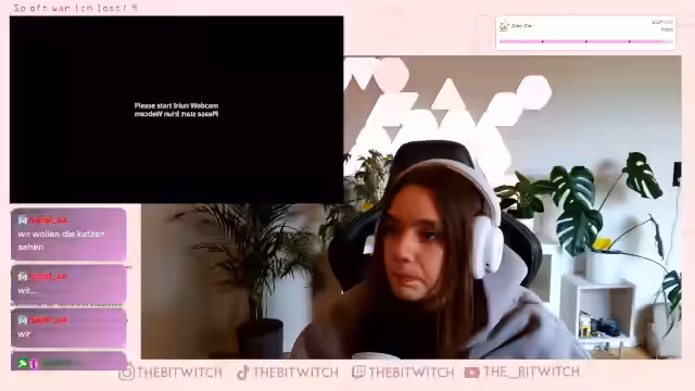 01:20:08Die Streamerin experimentiert mit der Höhe des Chats, um die Katzen besser im Bild zu haben. Sie diskutiert die Schriftgröße und Transparenz der Chatnachrichten. Nach wiederholten Anpassungsversuchen ist der Chat defekt und zeigt keine neuen Nachrichten an. Die Streamerin beschreibt sich selbst als perfekte Bug-Hunterin, die unbeabsichtigt alle findet. Nach einem OBS Reload und Teamviewer-Hilfe kann der Chat repariert werden, allerdings nur mit der Einstellung, dass die neuesten Nachrichten unten erscheinen.
