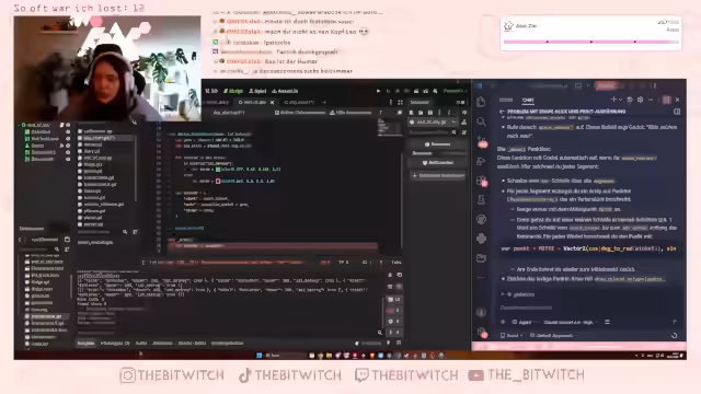 04:52:28Die Streamerin arbeitet an einem Code-Projekt, das mathematische Funktionen wie Sinus und Cosinus beinhaltet. Sie zeigt Frustration über mathematische Konzepte und Komplikationen mit dem Code. Dabei geht es um die Erstellung eines Diagramms, das Arbeits- und Betrugszeiten visualisiert, sowie um die Implementierung von Grafikelementen in einem Spielprojekt.