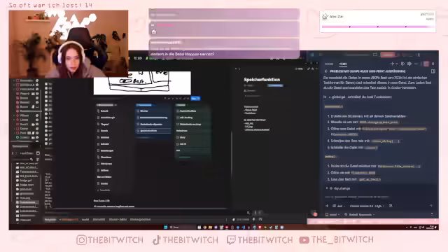 06:01:32Die Streamerin plant die Implementierung einer Speicherfunktion für ihr Spiel. Sie überlegt, welche Daten gespeichert werden müssen, darunter das Daylog und Full Log. Sie diskutiert auch zukünftige Funktionen wie einen Skilltree und Achievements. Sie erklärt, dass die Speicherung als JSON-Datei erfolgen soll, mit den wichtigsten Spielvariablen, die zwischen den Sitzungen beibehalten werden müssen.