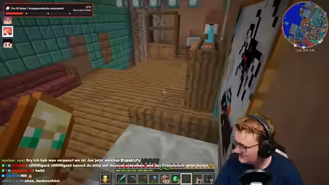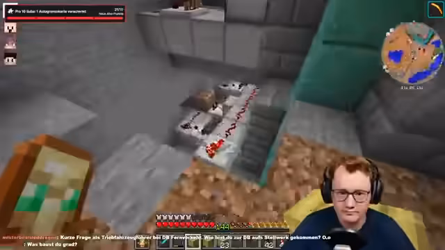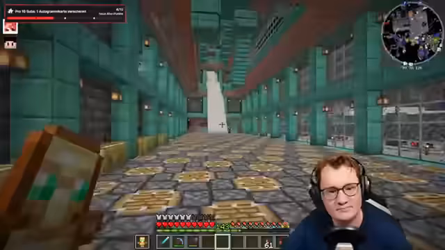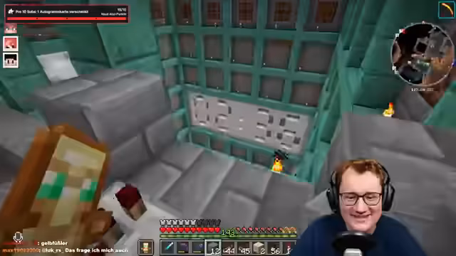 00:08:07Als finales Bauprojekt plant der Streamer eine komplexe Redstone-Schaltung für sein Labor. Er möchte, dass die Lampen zufällig an- und ausgehen und Animationen machen, was eine große Anzahl an Redstone-Lampen und Observers erfordert. Nach der Feststellung, dass der vorhandene Glowstone-Vorrat nicht ausreicht, wird eine Fehlfunktion im Item-Transportsystem festgestellt. Der Streamer beginnt, die Redstone-Leitungen zu reparieren, um wieder Sticks traden zu können, was für den Erwerb von weiterem Glowstone notwendig ist. Die erfolgreiche Reparatur des komplexen Systems wird gezeigt und gefeiert.