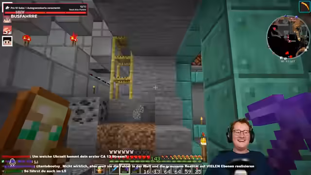 01:03:08Eine neue Methode zum Laden von Chunks wird vorgestellt, die darauf basiert, dass Enderperlen, die in Soul Sand fallen, die Chunks permanent laden, auch wenn der Spieler offline ist. Dies wird als clevere Anwendung der neuen Spielmechanik angesehen. Der Streamer berichtet von seiner Teilnahme an der Polaris-Messe, wo das Highlight das Treffen von Cosplayern, insbesondere von JoJo-Charakteren, war. Außerdem wurden andere bekannte Creator wie Tian, Krusty und Telika getroffen, was als sehr positiv bewertet wird. Ein humorvoller Vorfall wird erwähnt, bei dem der Streamer mit Gronkh verwechselt wurde, was ihm öfter passiert.