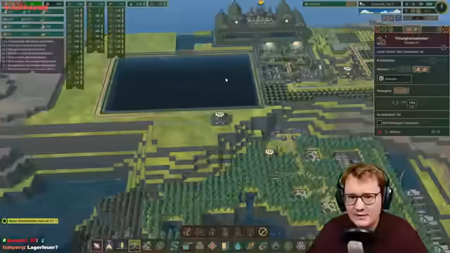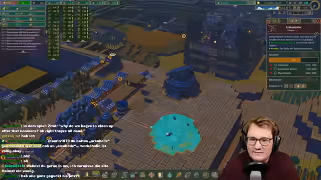00:06:48Der Streamer setzt seinen Timberborn-Spielstand fort und erläutert die Spielwelt: Nach dem Aussterben der Menschheit müssen Biber in einer trockenen und gefährlichen Umwelt überleben. Nach anfänglichen Schwierigkeiten gelang es der 'Pumpis'-Kolonie, durch eine komplexe Infrastruktur aus unterirdischen Pumpwerken, Stauseen und einem künstlichen Fluss eine dauerhafte und stabile Siedlung zu errichten. Die Kolonie ist gewaltig und umfasst über 419 Biber sowie verschiedene autonome Roboterviertel für die Nahrungsproduktion und Verarbeitung.