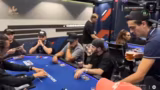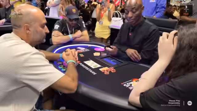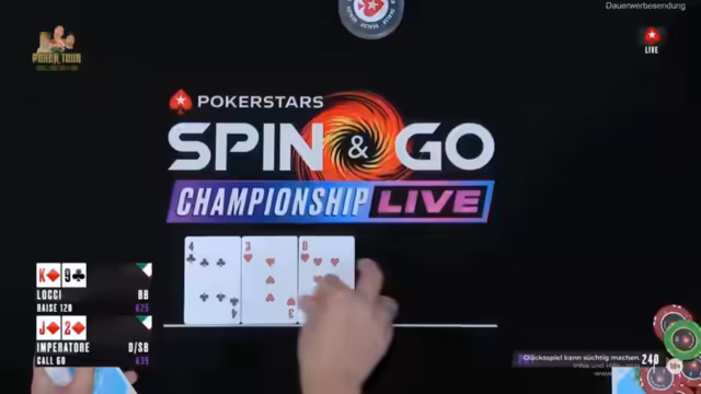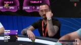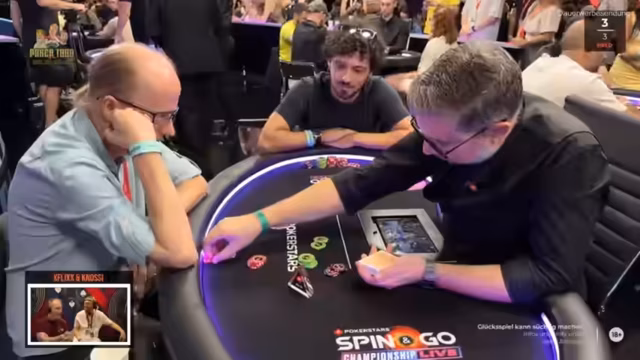 04:02:15Der Fokus verlagert sich auf das Spin-and-Go-Format, ein schnelles Pokerspiel mit nur drei Spielern. Der Streamer begleitet Adam McCollay, der an diesem Format teilnimmt. Während Adam sein Turnier startet, wartet der Streamer auf den Beginn von Knossis Turnier, das wegen der Übertragung auf einem sogenannten Feature Table zeitversetzt mit etwa einer halben Stunde Verzögerung gezeigt wird. Der Streamer verfolgt parallel die Action an den Spin-and-Go-Tischen.