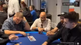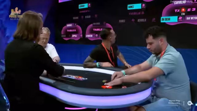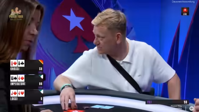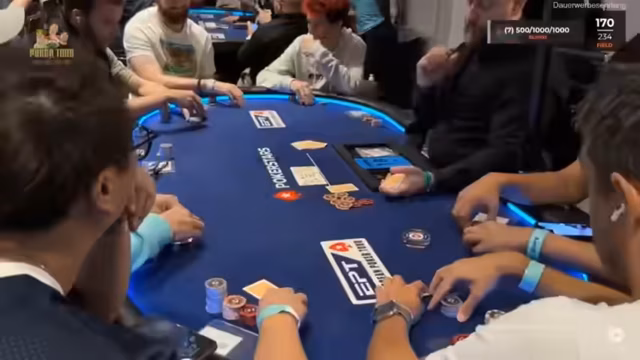 08:00:30Nachdem ein weiterer Spieler aus dem Turnier ausgeschieden ist, startet eine neue Runde mit neuen Blinds. Knossi nutzt die Gelegenheit, seine Chips auszubauen, indem er aggressiv spielt. Die Kommentatoren analysieren seine Handlage und seine Strategie und stellen fest, dass er sich warm spielt. Immer mehr Chips sammelnd, positioniert er sich für einen möglichen Sieg im gesamten Event. Der Wechsel der Blinds zwingt alle Spieler, sich neu zu justieren und ihre Taktiken anzupassen.
