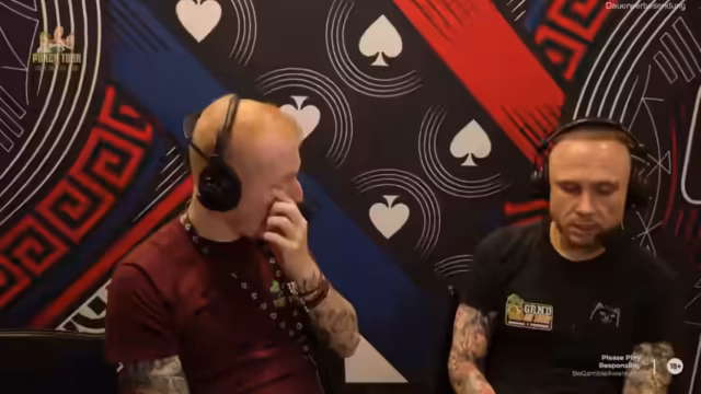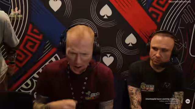08:28:39Ein Kommentator äußert sich zu einer vorherigen Hand von Knossi und erwähnt, dass dieser den Call verpasst habe. Es folgen Hinweise auf technische Einstellungen für die Übertragung. Zudem wird Werbung für die Plattform Grindpoker gemacht, auf der Zuschauer an Turnieren teilnehmen können. Der Fokus liegt auf einem Angebot für den aktuellen Tag. Anschließend wird ein Spieler namens Christoph vom Rail aus angesprochen, der im Chat präsent ist. Die aktuelle Hand wird geschildert, bei der Knossi mit Ass-Dame gegen einen Gegner, der den Flush getroffen hat, am Showdown scheitert und den Pot verliert. Ein Gegner namens Luthi aus dem gestrigen Stream wird im Chat gegrüßt.