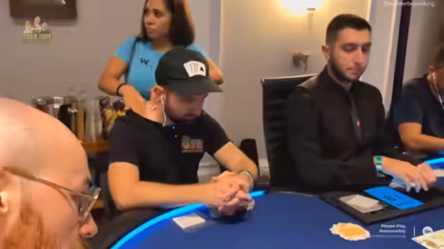 04:24:07Der Streamer begleitet Adam McCollay persönlich zu seinem Turniertisch für ein 2200-Euro-Deep-Stack-Event. Hierbei wird der Prozess des Anmeldens und das Verteilen eines neuen, vollen Chip-Stacks von 50.000 gezeigt. Es wird kurz das Konzept des 'Late Registration' erläutert, bei dem Spieler später ins Turnier einsteigen können, um Energie zu sparen. Der Streamer wünscht Adam viel Glück und überwacht dessen erste Hände am Tisch.