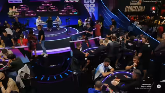 Ein Pokerturnier im Wert von 250.000€ wurde in Barcelona gestartet. Teilnehmer nehmen an einem Spin-and-Go-Format teil, das aus 90 Spielern besteht. Um ins Finale einzuziehen, ist es notwendig, vier Matches zu gewinnen. Die Atmosphäre am Spieltisch wird als professionell beschrieben.