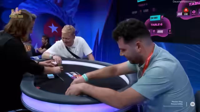 06:29:30Bei einem Tisch wird ein technischer Fehler gemeldet, der zu einer falschen Darstellung der Chipwerte führte. Der Kommentar vermerkt, dass solche Fehler passieren können und betont die Pflicht der Spieler, auf korrekte Darstellung zu achten. Nach einer knappen Niederlage gibt er einen wichtigen mentalen Tipp: Wenn man nicht in der richtigen Verfassung ist, keine Bankroll hat oder schlechte Laune hat, sollte man auf keinen Fall Poker spielen, da dies ein 'fataler Fehler' für das Mindset sein kann.
