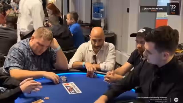 09:16:40Adam befindet sich in einer entscheidenden Situation mit einem kleinen Stack. Er geht mit Ass-Zehn vor dem Flop all-in und bekommt einen Call von einem Gegner mit Ass-König. Die Boardkarten führen jedoch dazu, dass der Gegner mit der besseren Hand gewinnt und damit aus dem Turnier ausscheidet. Kommentator Felix analysiert die mutige, aber letztlich nicht erfolgreiche Spielweise. Parallel wird verfolgt, dass Knossi sich für ein 1000-Euro-Hyper-Turnier angemeldet hat. Es gibt kurze technische Störungen, bevor der Stream zu Knossi am neuen Tisch wechselt, wo das Turnier gerade beginnt.