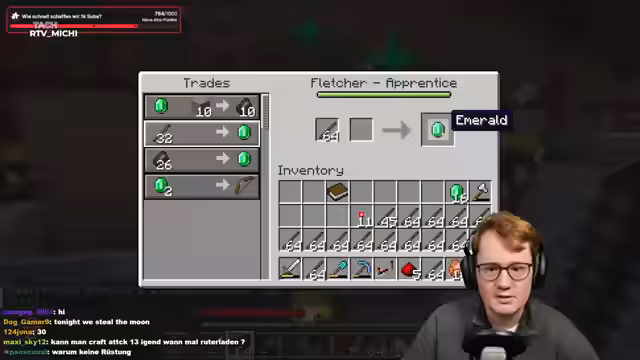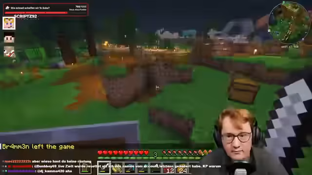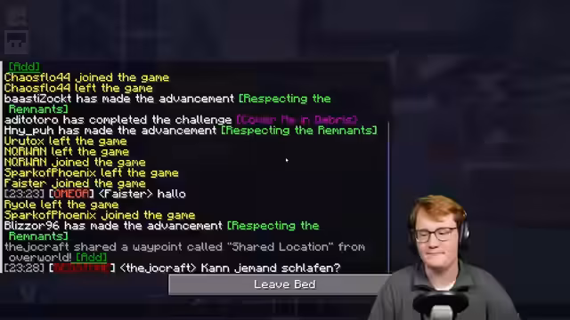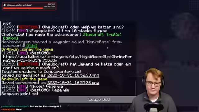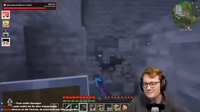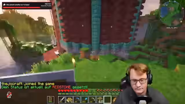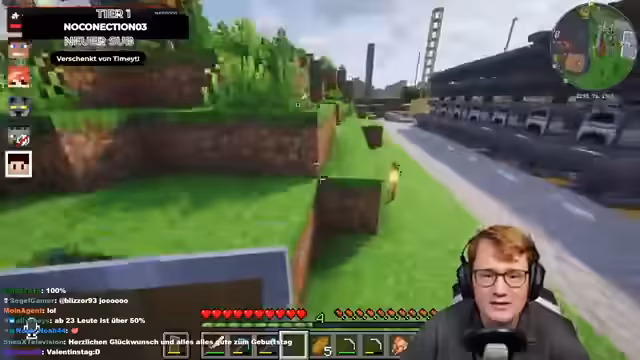 05:51:42Der Streamer befindet sich in der „Chris-Show“, wo er eine Frage beantwortet, die sich um Redstone-Bauweisen dreht. Die Frage ist, ob man Joe über den Chat, selbst oder Barbara Schöneberger fragt. Die Antwort „Barbara Schöneberger“ wird als korrekt eingeloggt, und der Streamer wird zum „Redstone-Millionär“ erklärt. Kurz darauf treten jedoch massive Serverprobleme auf, die sich durch ständige Verbindungsabbrüche und Lags äußern. Es wird vermutet, dass ein Chunkloader in der Nähe des Glashauses kaputt ist, was die korrekte Befüllung des Autocrafters behindert. Die Schwierigkeiten führen dazu, dass der Streamer immer wieder aus dem Spiel fliegt und die Kommunikation erschwert wird. Diese technischen Schwierigkeiten beeinträchtigen den Spielfluss erheblich und erfordern ständige Anpassungen.