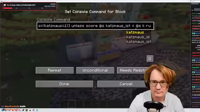 02:32:34Der Fokus verschiebt sich auf den technischen Aufbau der Spiel-Engine. Es wird ein Scoreboard-System mit verschiedenen Variablen wie 'Katzmaus_ID', 'Size' und 'Team' entworfen. Zentral ist die Entwicklung eines ID-Systems, um jedem Spieler ein einzigartiges Tier (Maus oder Katze) zuzuordnen und synchron zu halten. Die Streamer arbeiten mit einem komplexen verschachtelten Turm aus Command-Blöcken, um Spieler zu identifizieren, ihnen IDs zuzuweisen und die entsprechenden Tiere zu spawnen und zu teleportieren.