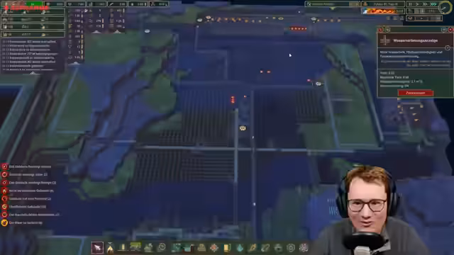 03:10:43Die Wasserversorgung mittels Pumpen ist ein zentrales Thema. Die Pumpen laufen auf voller Leistung und erzeugen eine beeindruckende Flussgeschwindigkeit von fast 2 Kubikmeter pro Sekunde. Dies führt jedoch zu massiven Problemen, da es zu ständigen Überflutungen in der Umgebung kommt. Der Flusslauf ist unvorhersehbar und gefährdet die Biber und die Landwirtschaft. Der Streamer ist unzufrieden mit dem aktuellen Zustand und erkennt, dass das System extrem fragil ist und dringend eine Lösung benötigt wird, um die Landstriche zu schützen.