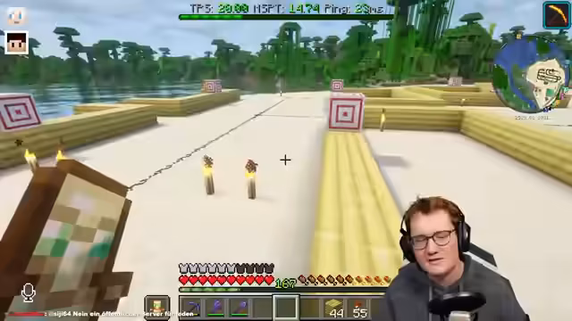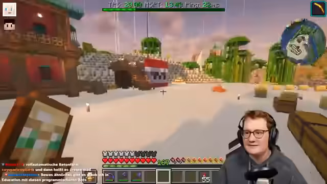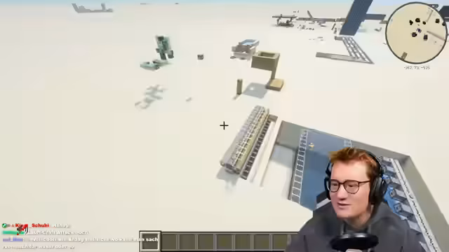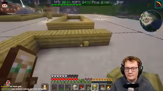 02:49:18Nach der Erweiterung der Wüstenfläche beginnt die detaillierte Planung eines neuen Ritt-Attraktionsspiels im Wild-West-Stil. Der Streamer skizziert den Aufbau: Ein Startgebäude soll als Einstiegspunkt dienen, von dem aus ein Pfad durch eine westerninspirierte Szenerie führt – inklusive Saloon, Geisterstadt und Prärie-Elementen. Das Spiel soll später vollautomatisiert per Minecart ablaufen, ähnlich wie der Original-Freizeitpark. Als Herausforderung identifiziert er die Integration der Achterbahn in die Mitte des Geländes und die Schaffung eines klaren Wegverlaufs. Geplant sind außerdem Zäune als Begrenzung und Banner zur Anzeige von Spielinformationen. Die Umsetzung erfordert kreative Lösungen für Fassaden und Stadtbau, um Authentizität zu gewährleisten.