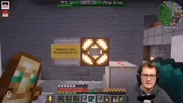 04:02:40Die Planung des Teleporter-Projekts wird konkretisiert: Es soll sowohl ein One-Way-Teleporter zum Shopping District als auch ein Login/Logout-basierter Retour-Teleporter gebaut werden. Diskutiert werden Standortüberlegungen für die Anlage, wobei die Nähe zum Lager als ideal angesehen wird. Für den Bau werden Enderperlen benötigt, die über Villager-Trades organisiert werden sollen. Der Teleporter ermöglicht theoretisch sofortige Rettung aus gefährlichen Situationen wie Lava-Fällen.