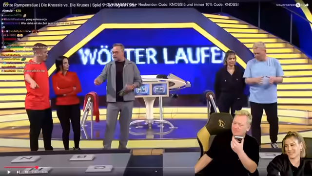 00:32:11Es geht zurück zum Spiel 'Wörter laufen', bei dem die Teilnehmer mit Kopfhörern und Brillen ausgestattet sind. Der Streamer beschreibt die Schwierigkeiten des Spiels, da man die Buchstaben nicht sehen kann und nur durch Haptik reagieren muss. Er erwähnt auch die Strategie, die Buchstaben einzeln auszusprechen und aufeinander zu warten. Das Spiel verläuft knapp und endet mit einem Sieg für eine Seite.
