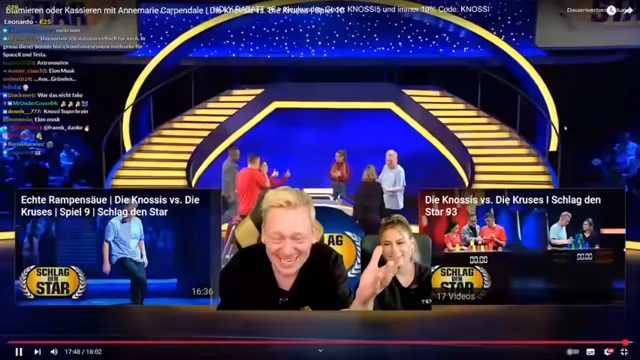 01:38:41Nach mehreren Runden steht der Punktestand bei 4:2 für das Team Knossi. Der Streamer kommentiert die verpassten Gelegenheiten und die Angst der Teilnehmer, zu früh zu buzzen. Er gibt auch Einblicke in seine eigenen Denkprozesse während der Fragen und wie er sich manchmal in die Irre führen lässt. Die Themen der Fragen reichen von aktueller Politik bis hin zu Unterhaltung und Sport.