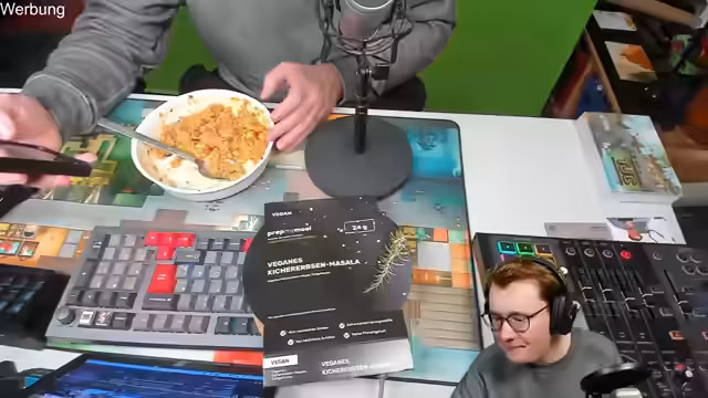 03:33:37Prep My Meal (PMM) wird als Sponsor mehrfach integriert, mit detaillierten Beschreibungen veganer Gerichte wie Couscous und Kichererbsenmasala. Trotz technischer Herausforderungen – darunter erneute Tode und Item-Verluste – feiert das Team Teilerfolge beim Craften der roten Schallplatte. Die Stimmung bleibt trotz Rückschlägen positiv, begleitet von Produktplatzierungen.