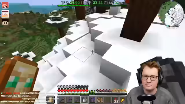 05:25:05Nach der technischen Entwicklung widmet sich der Streamer dem visuellen Design des Boost-Towers. Er integriert Schallplatten (darunter eine seltene 'Relic'-Platte) und plant eine Kristallhöhle mit durchsichtigem Eis. Parallel liefert er Material für seine Item-Challenge an (u.a. Melonsamen, Jungle-Treasure-Plate). Es folgen Feinjustierungen der Redstone-Verzögerung und der Lichtverhältnisse. Ein größerer Test des Gesamtsystems zeigt jedoch, dass die Kollisionserkennung im Eis-Tunnel noch Probleme bereitet. Der Streamer demonstriert trotzdem stolz den aktuellen Stand und die Dynamik der Anlage.