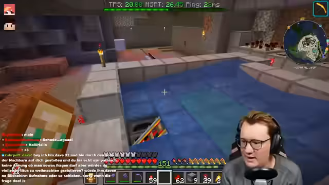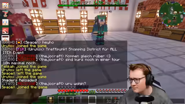02:57:16Technische Probleme dominieren die Endphase: Blitzableiter können nicht oxidieren (Versionskonflikt), und weitere Shulker fallen in Lava. Die Lösung wird von Banco (Server-Admin) programmiert – Teilnehmer müssen eventuell reconnected, um geblockte Slots zu lösen. Gleichzeitig werden letzte Items wie Tuff-Steinstufen, Schafwolle und Glas für Shulker-Scheiben besorgt. Trotz der Probleme läuft die Kooperation reibungslos: Space und sein Partner lagern erfolgreich Items ein. Am Ende fehlen noch Farb- und Crafting-Herausforderungen, die aber mit Community-Hilfe (z. B. Chat-Abfragen) angegangen werden.