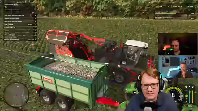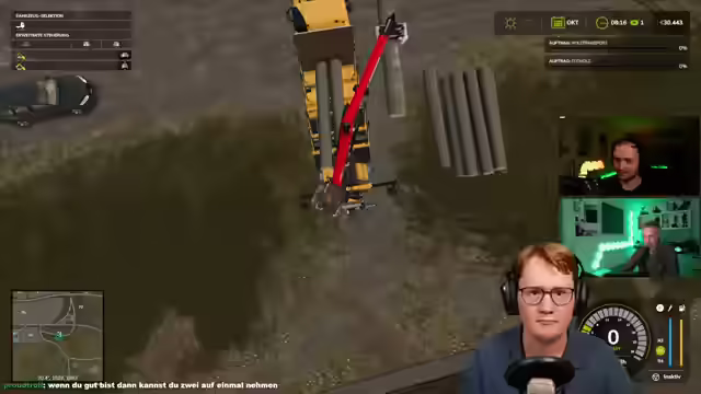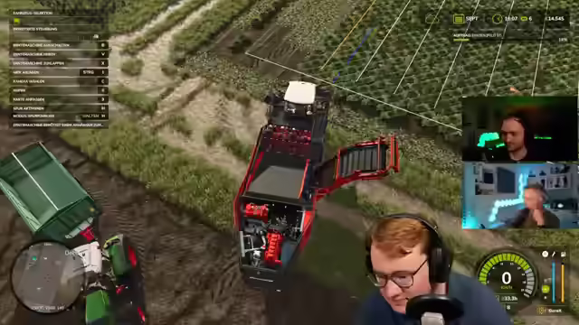 00:33:09RGB Pixel trifft ein und positioniert sich auf der rechten Seite des Streamers. Der Tempomat wird auf 10 km/h eingestellt, aber die Maschine kann nur 8 km/h fahren. Die Spurführung bei RGB Pixel funktioniert nicht. Der Streamer stellt fest, dass er den schlechtesten Auftrag für das wenigste Geld ausgewählt hat. Das Ernten wird voraussichtlich lange dauern, und es drohen Strafen bei Nicht-Erfüllung des Auftrags. Der Streamer und RGB Pixel lernen, mit den Maschinen umzugehen. Die Maschine erntet nicht richtig, und RGB Pixel fährt den Trecker kaputt. Es geht viel Erntegut daneben. Debi wird zur Unterstützung gerufen, da der Anhänger schnell voll wird. Die Innensicht der Maschine wird als mega cool empfunden. Der Streamer findet die Steuerung anstrengend und vermisst den Spurhalteassistenten. Die Maschine fährt schief, aber die Spurführung funktioniert wieder. Der Streamer stellt fest, dass die Landwirtschaft mittlerweile fast alles automatisch macht. Es wird gewartet, bis der Rest abgeladen ist.